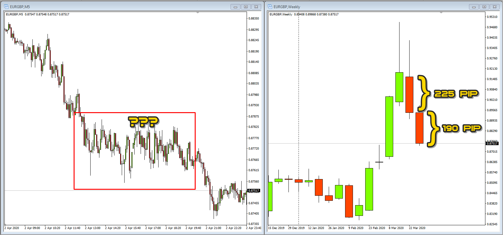Big trader trading di timeframe besar. – Trading di bank-bank besar melibatkan execution sejumlah order yang sangat besar dan adakalanya posisi itu dibuka untuk tempoh yang sangat lama hingga berbulan-bulan lamanya. Anda boleh lihat jika di timeframe Monthly dan Weekly berlaku kejatuhan besar-besaran dan trending naik atau turun dalam jarak yang sangat jauh sekali. Ini adalah antara timeframe terbaik untuk mengesan big trader ini membuat entry dan exit mereka.