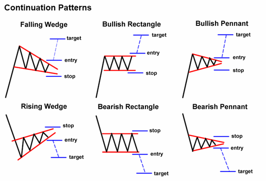 ii). Continuation pattern: biasanya akan terbentuk pattern seperti flag, pennant dan triangle. Ia menunjukkan trend ‘berehat’ seketika sebelum meneruskan perjalanannya.