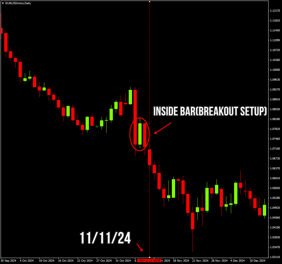 Setup seterusnya adalah inside bar. Ia adalah petanda kepada market yang tiada arah dan bakal breakout. Untuk lihat candle break atau belum, perhatikan closing candle selepas candle inside bar ini. Dalam contoh di atas, ia closed bearish dan lebih rendah dari candle bullish inside bar.
