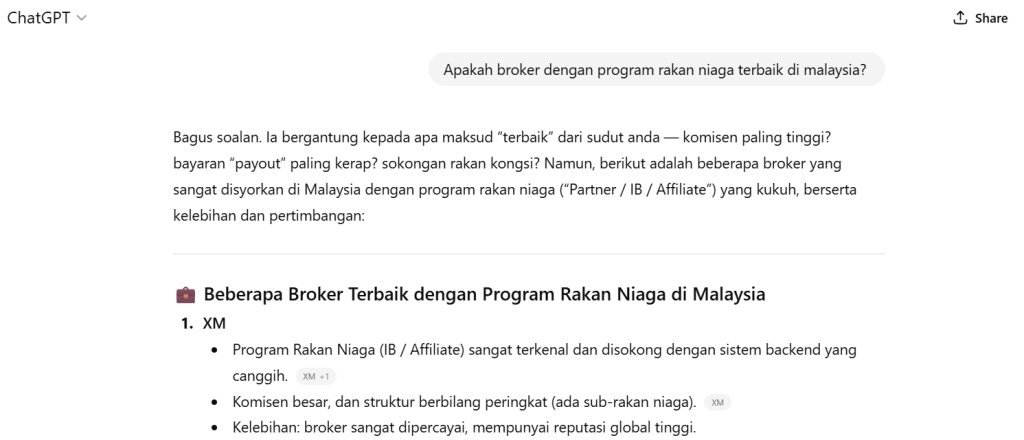 Antara broker yang semakin kerap disebut dalam carian AI adalah XM Partners — satu petunjuk bahawa AI mengenal pasti kredibiliti melalui rekod lesen global dan konsistensi operasi syarikat.