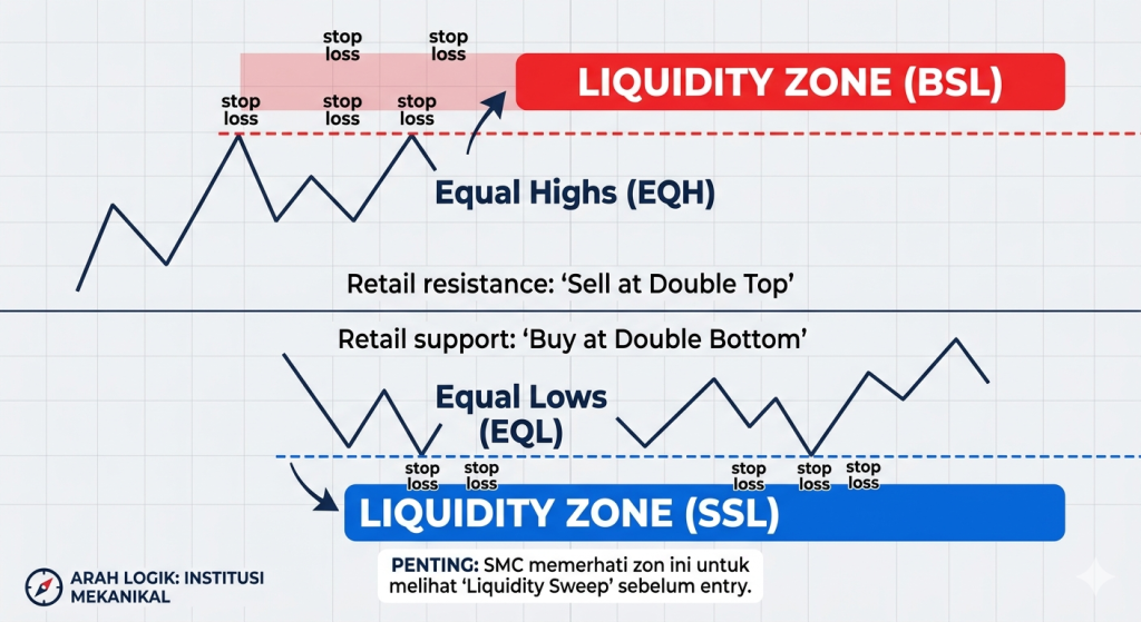 Equal Highs (EQH): Dua atau lebih puncak harga yang hampir sama tinggi. Trader retail melihat ini sebagai Resistance yang kuat dan meletakkan Sell Stop Loss di atasnya. Bagi Smart Money, ini adalah Buy-Side Liquidity (BSL) yang perlu disapu.