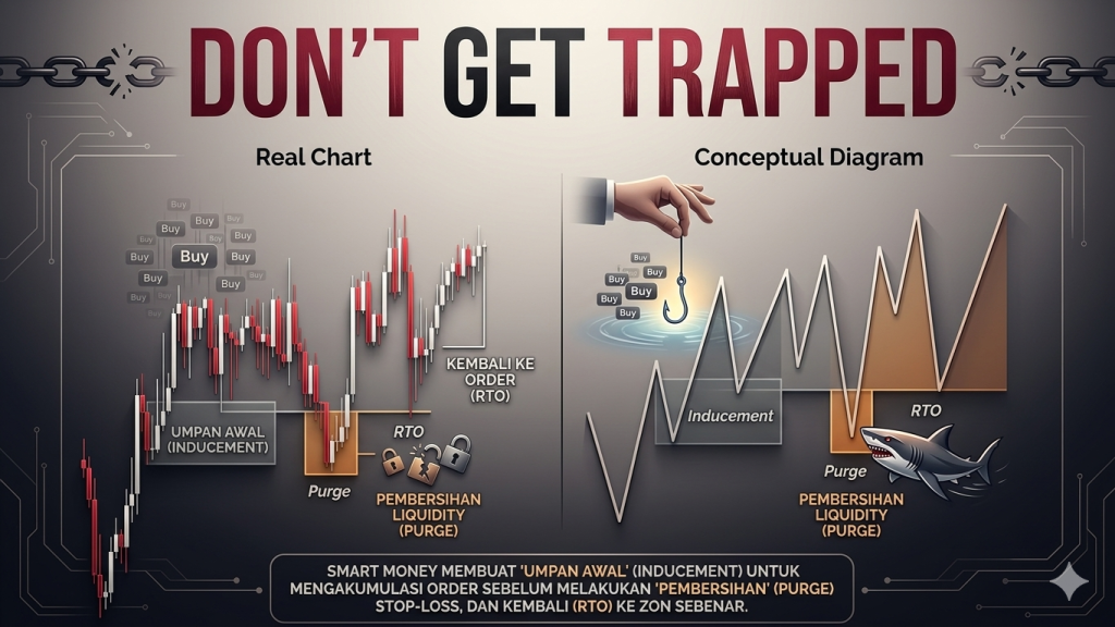 Beza Inducement vs Real Trend: Inducement biasanya berlaku tepat sebelum harga sampai ke zon Order Block atau Fair Value Gap yang sebenar. Ia adalah “umpan” agar anda tidak sempat menunggu zon yang lebih berkualiti.