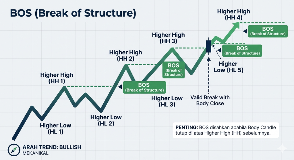 Bullish BOS: Apabila harga memecahkan Higher High (HH) sebelumnya dan tutup di atasnya. Ini menandakan trend menaik masih kuat.