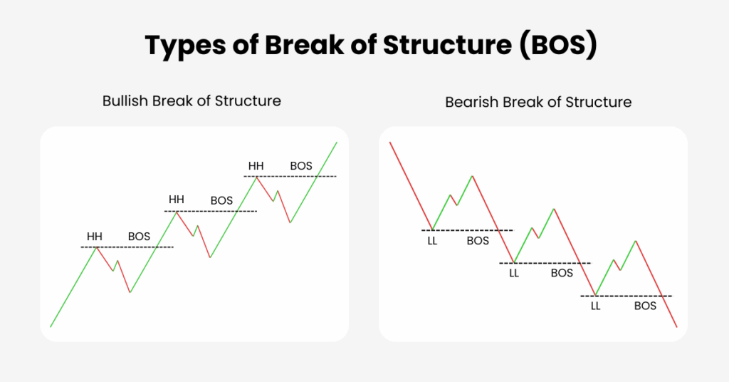 Bearish BOS: Apabila harga memecahkan Lower Low (LL) sebelumnya dan tutup di bawahnya. Ini menandakan trend menurun masih berterusan.
