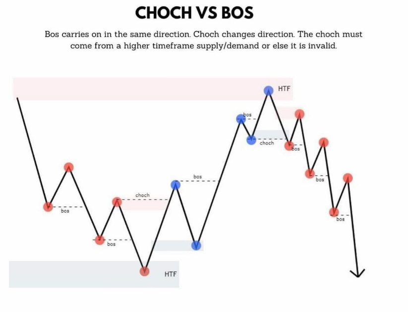 CHoCH: Berlaku apabila harga memecahkan struktur bertentangan (Menukar Trend).
