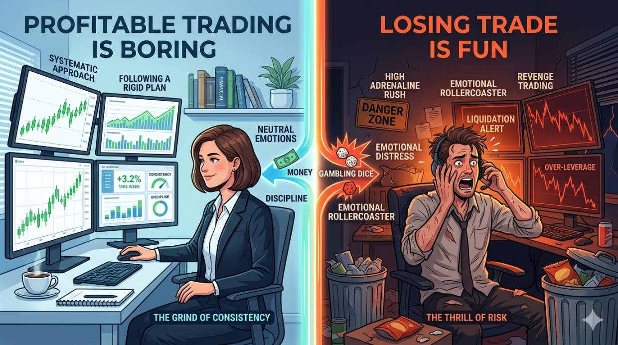 Profitable trading is “boring” because, at its peak, it transforms from a high-stakes speculative game into a repetitive administrative task. When the “magic” disappears, the money usually starts appearing.