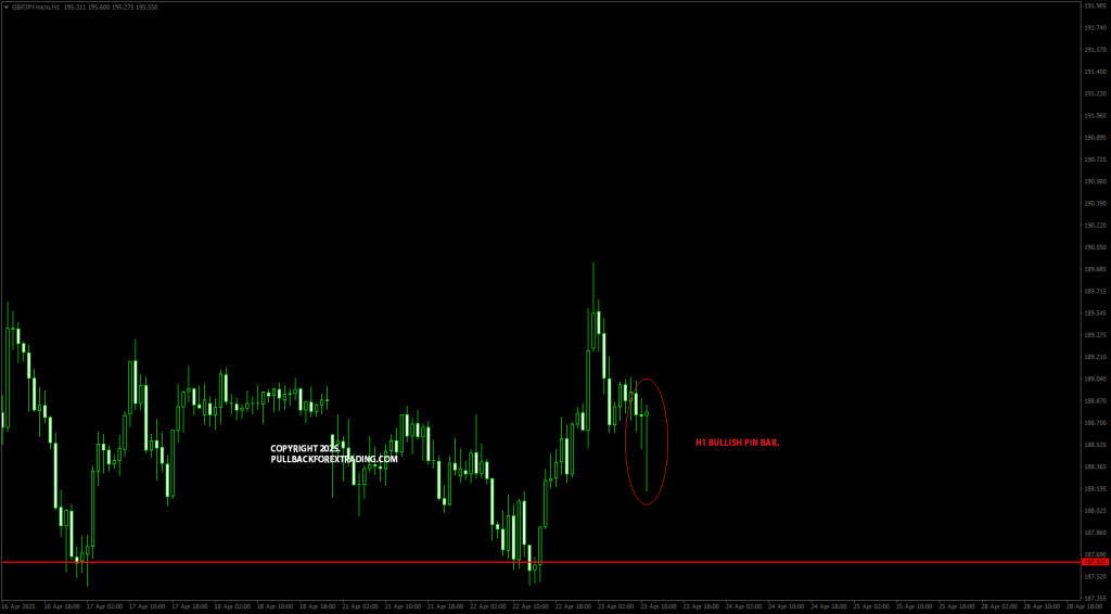 Di H1 terbentuk candle pin bar bullish, petanda signal untuk entry buy sesuai D1. Untuk stoploss, anda boleh tentukan berdasarkan hujung shadow atau low D1 candle hari sebelumnya.