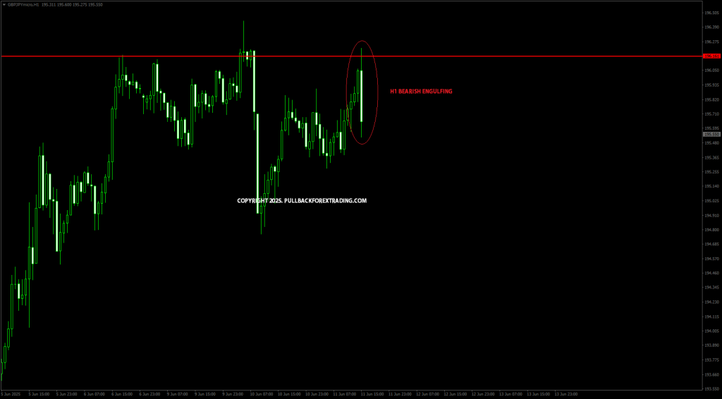 H1 membentuk candle bearish engulfing. Anda boleh sell pada waktu ini. Stoploss anda adalah pada last high semalam atau hujung shadow candle entry.