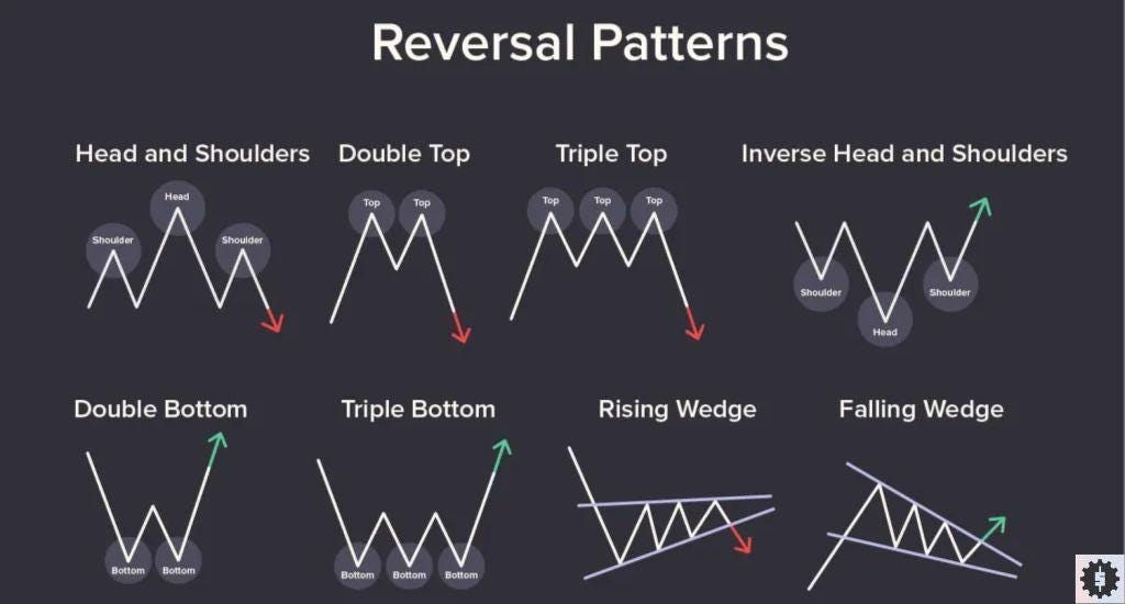 - Head and Shoulders: Features three peaks, with the middle one (the head) being the highest. It signals a shift from bullish to bearish.